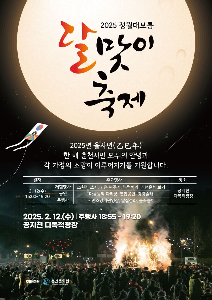 2025년 춘천 정월대보름 달맞이축제는 가족과 친구들이 함께 모여 전통을 즐기고, 소중한 추억을 만들어가는 특별한 행사입니다. 보름달 아래에서 모두가 하나 되는 이 순간을 놓치지 마세요! 여러분의 많은 참여를 기다립니다.